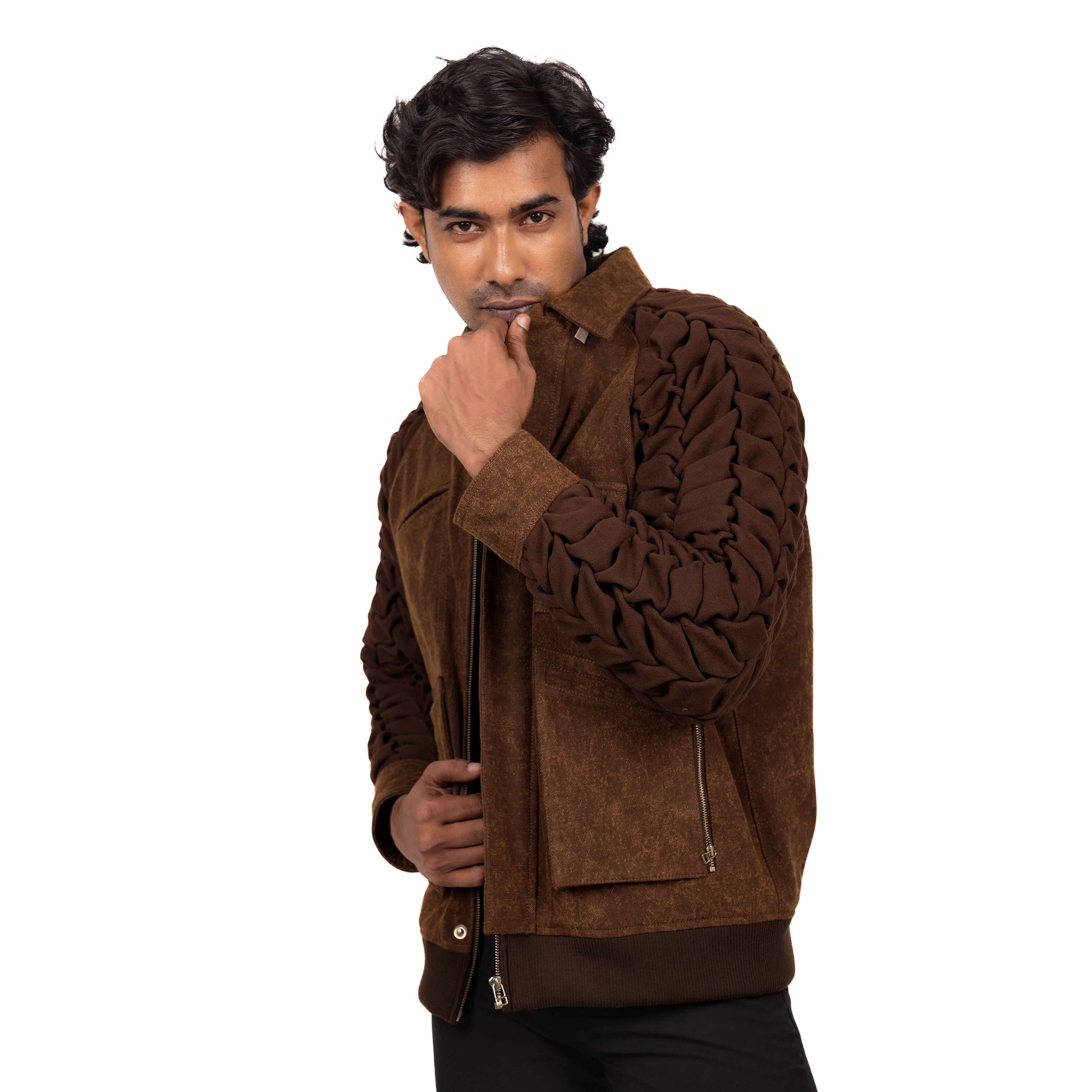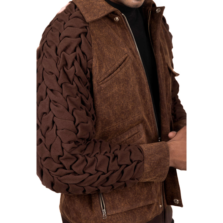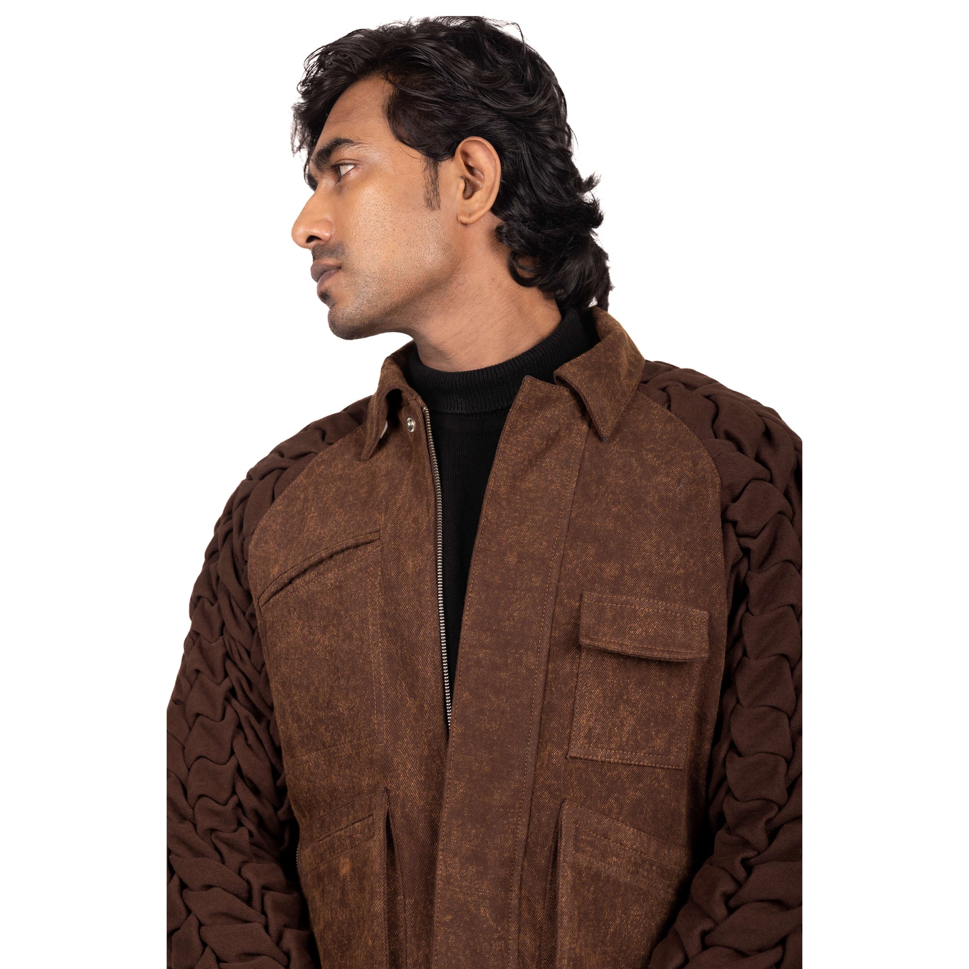 A symphony of pockets, including welt, patch, and gusset styles, offers a utilitarian edge. Smocked raglan sleeves and rib trimming add a touch of comfort, while a metal zip closure completes the look. Washed brown denim creates a grounded feel.