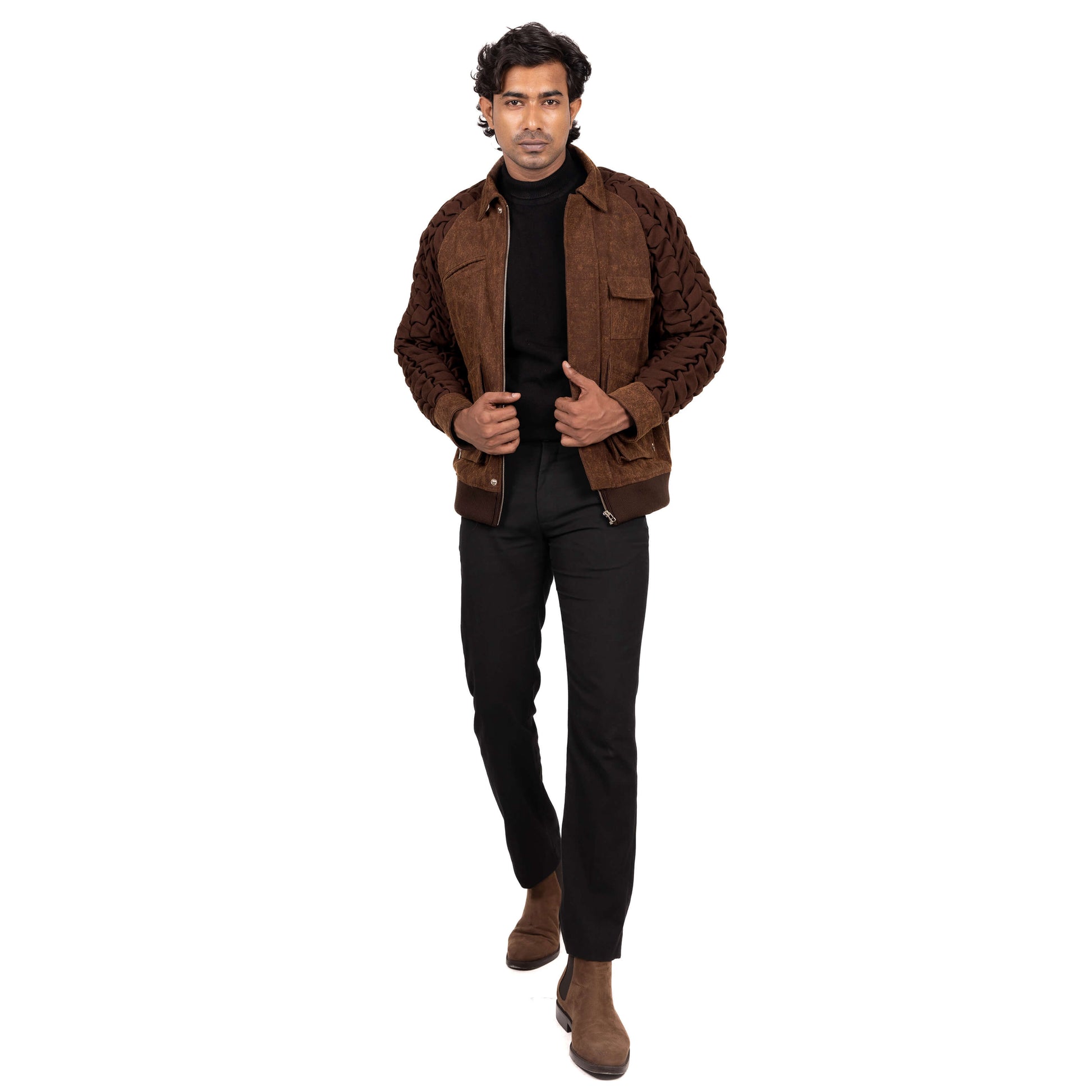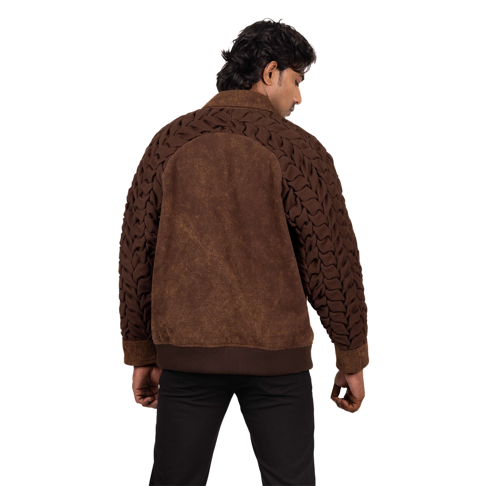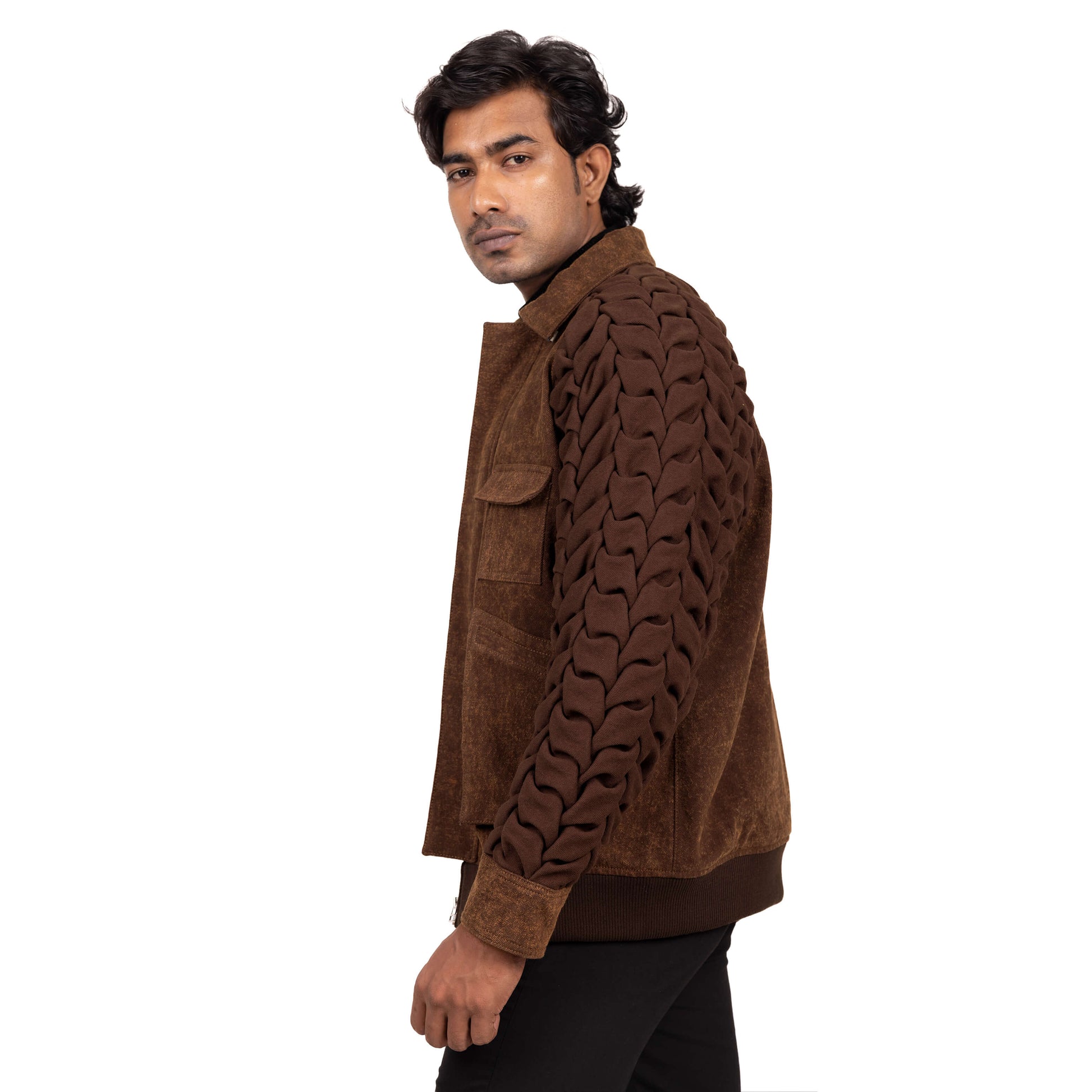 A symphony of pockets, including welt, patch, and gusset styles, offers a utilitarian edge. Smocked raglan sleeves and rib trimming add a touch of comfort, while a metal zip closure completes the look. Washed brown denim creates a grounded feel.
