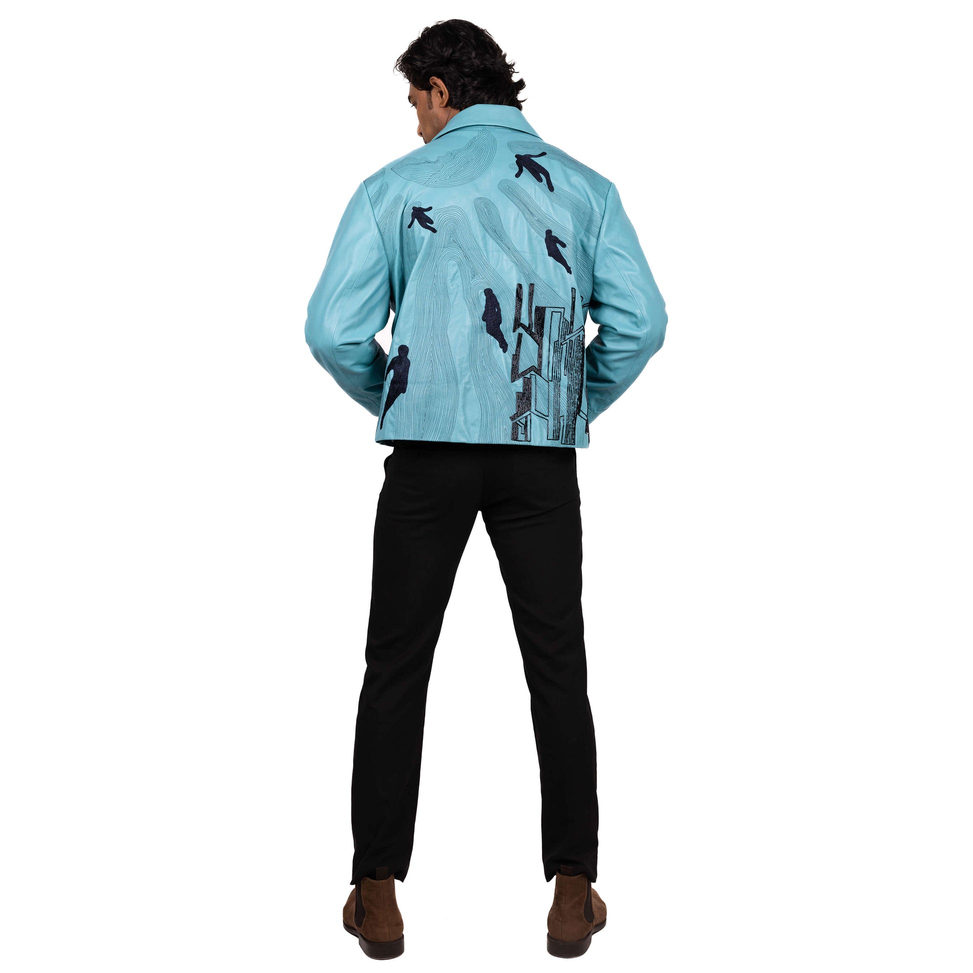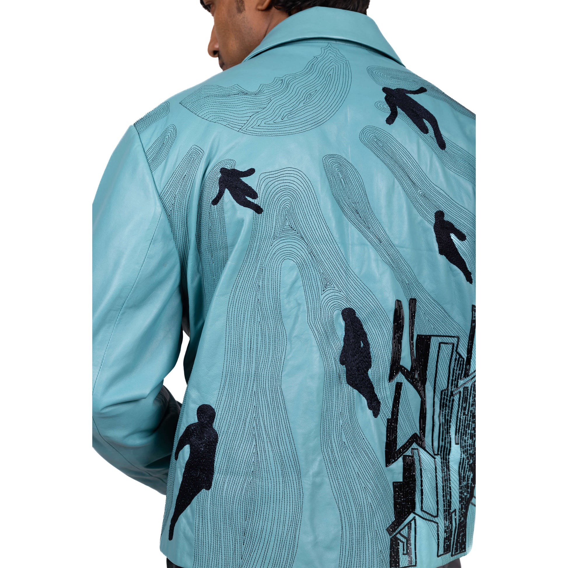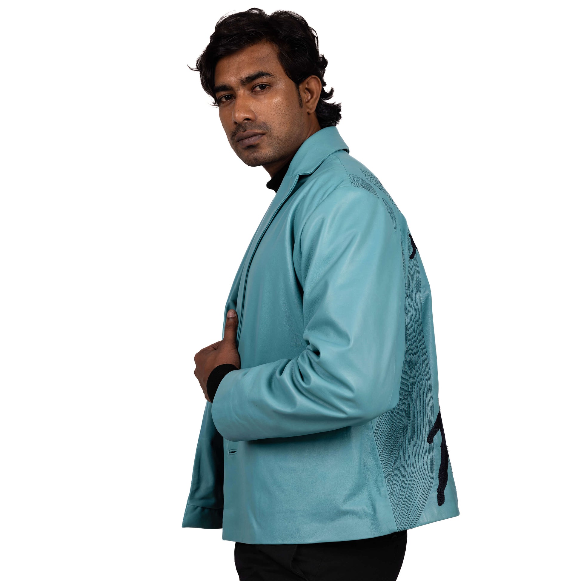Ethereal figures break free on the basalt-coloured genuine sheep napa leather, symbolizing the power of individuality. The notch lapels, welt pockets, and horn button closure offer a classic touch, while the asymmetric back embroidery adds a rebellious twist.