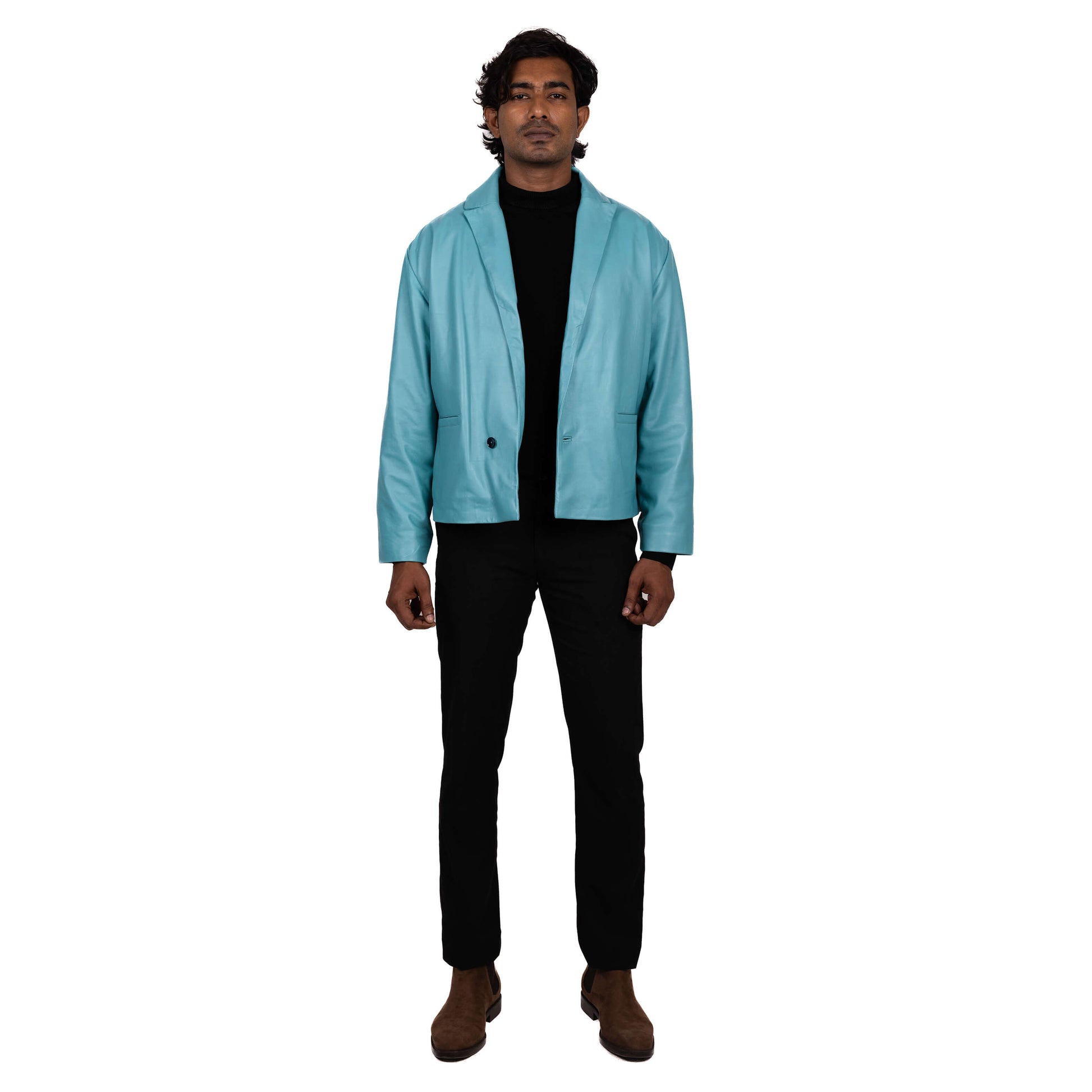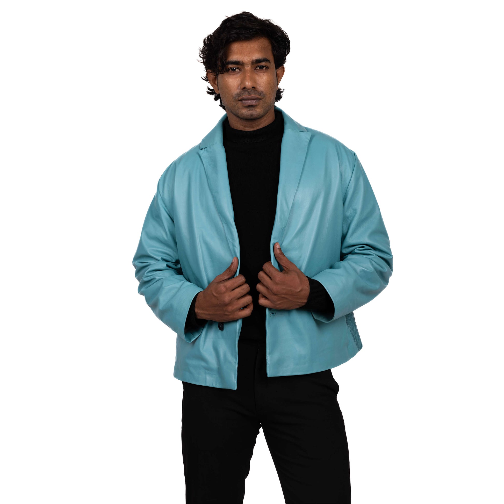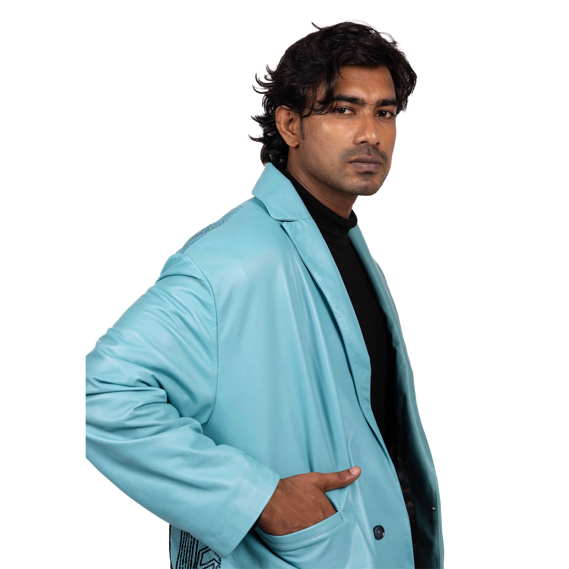 Ethereal figures break free on the basalt-coloured genuine sheep napa leather, symbolizing the power of individuality. The notch lapels, welt pockets, and horn button closure offer a classic touch, while the asymmetric back embroidery adds a rebellious twist.
