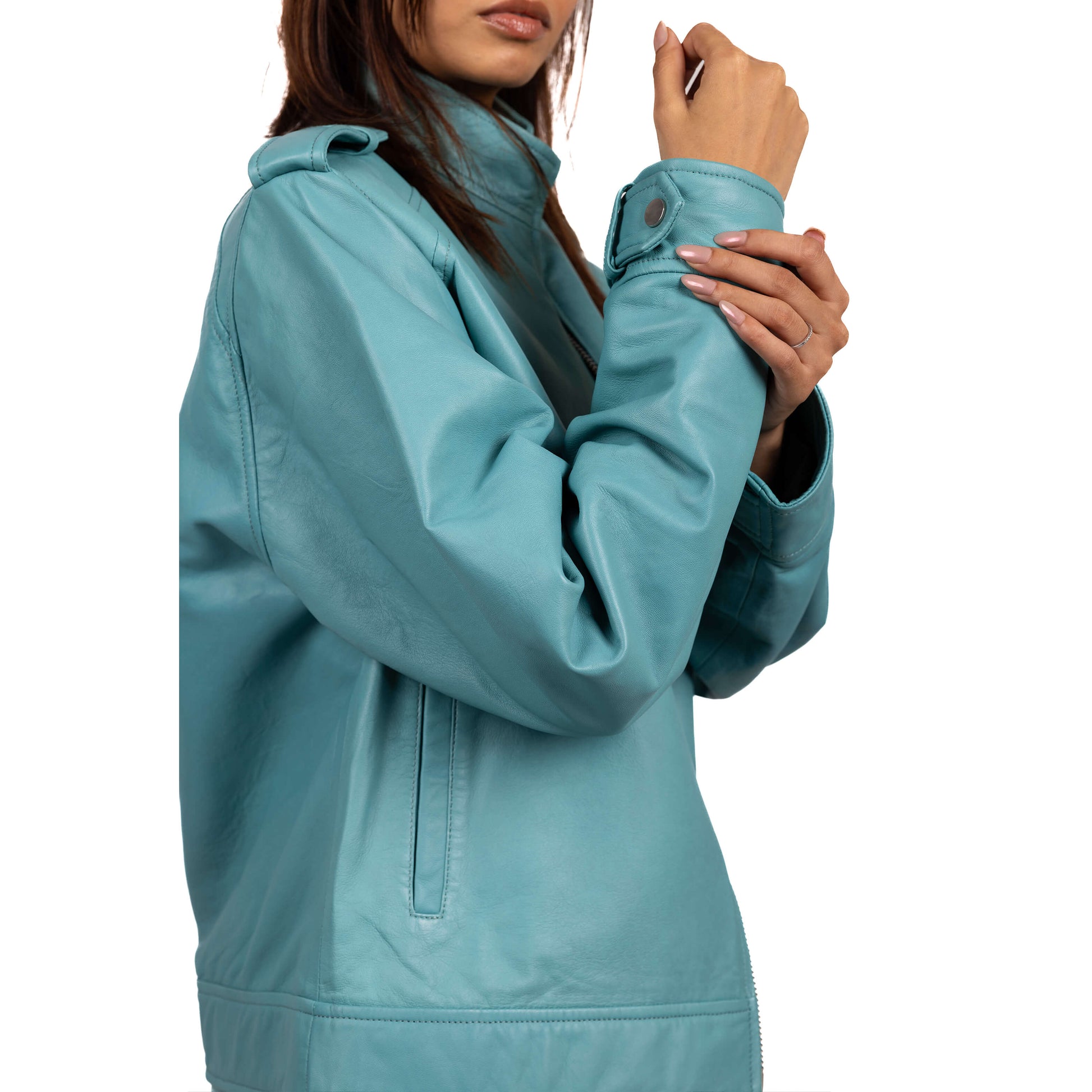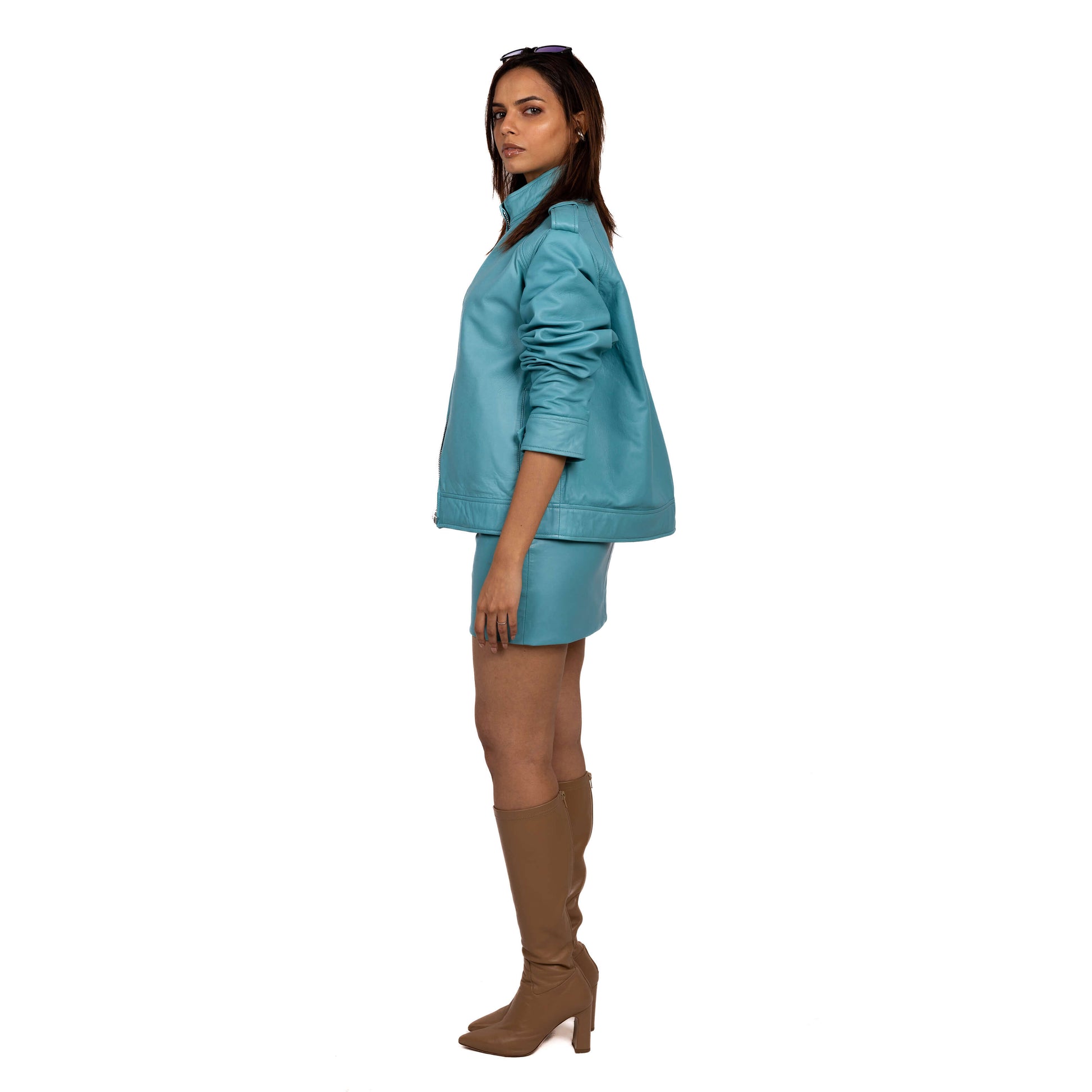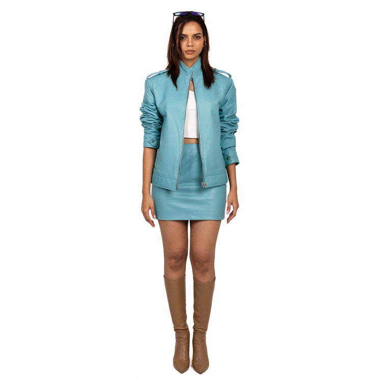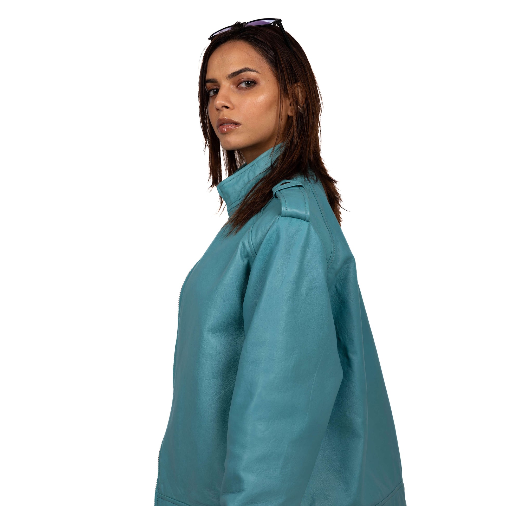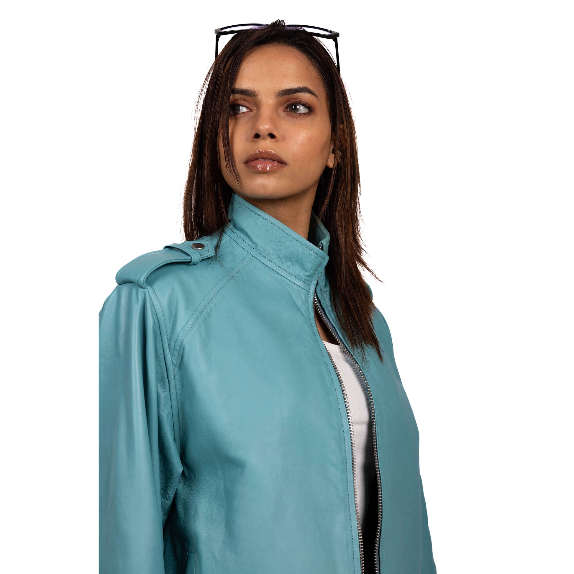 A sleek race jacket in basalt-colored genuine lamb napa leather, representing the power to transcend societal constraints. The Nehru collared, fitted racer silhouette with epaulettes, unwavering presence. Welt pockets add a touch of functionality, while the center front zipper closure completes the look.
