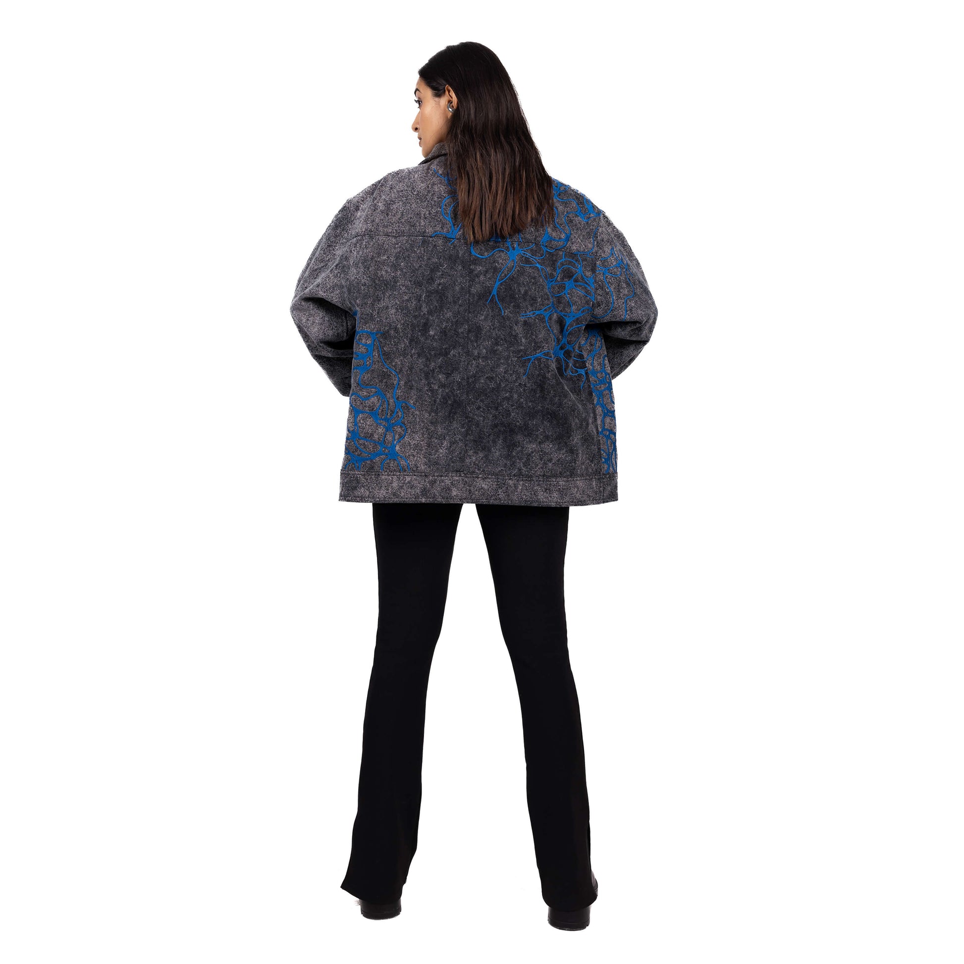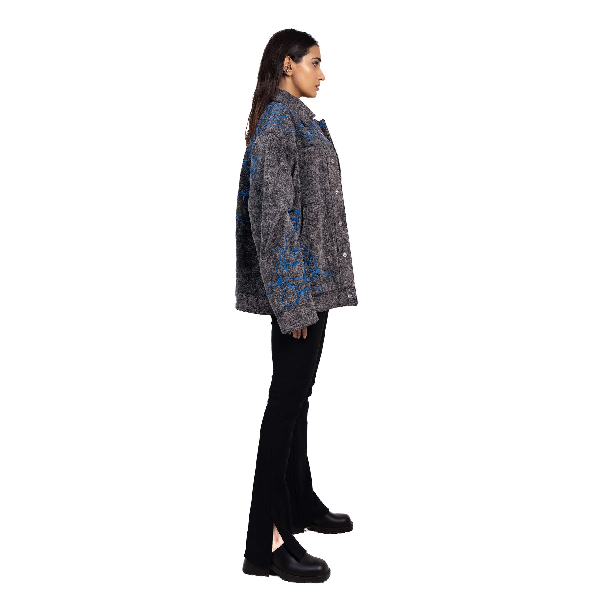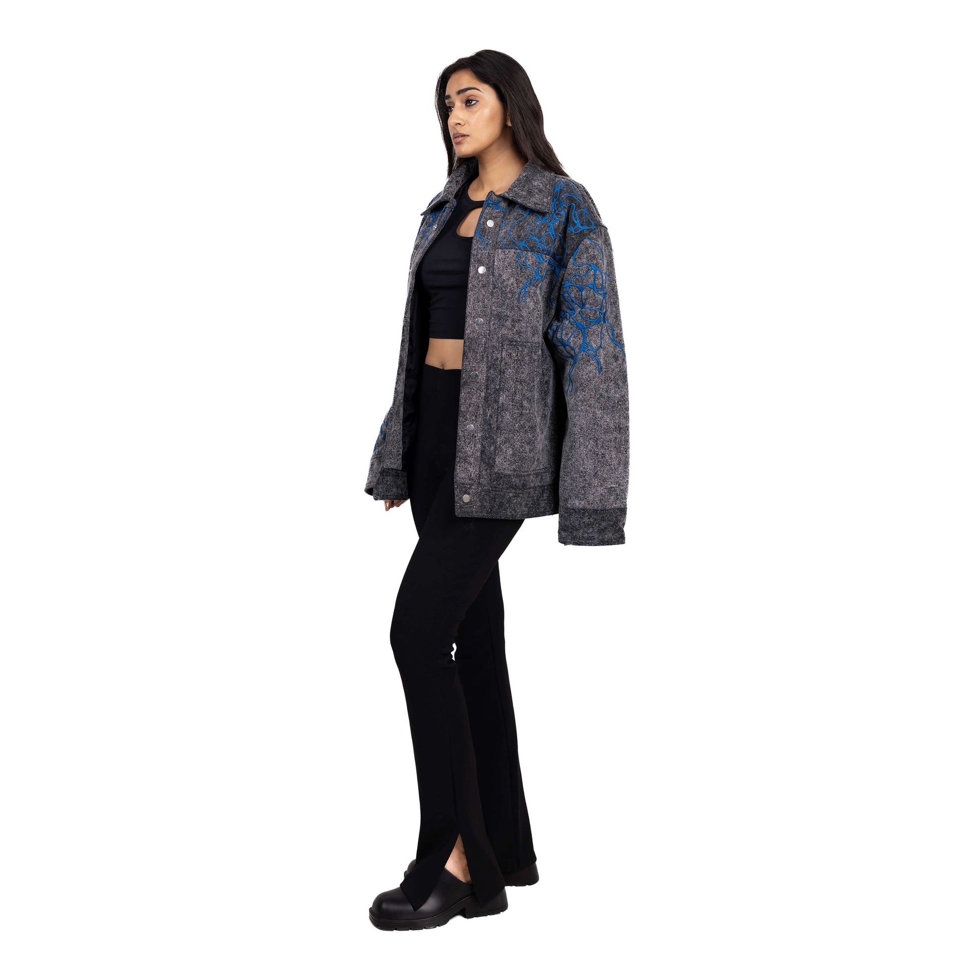 Embroidered roots surge with defiant energy across the black, washed denim. The relaxed fit and metal snap closures on the front and cuffs offer comfort and style. Patch pocket detailing adds a touch of functionality, while the all-over contrast embroidery makes a bold statement.