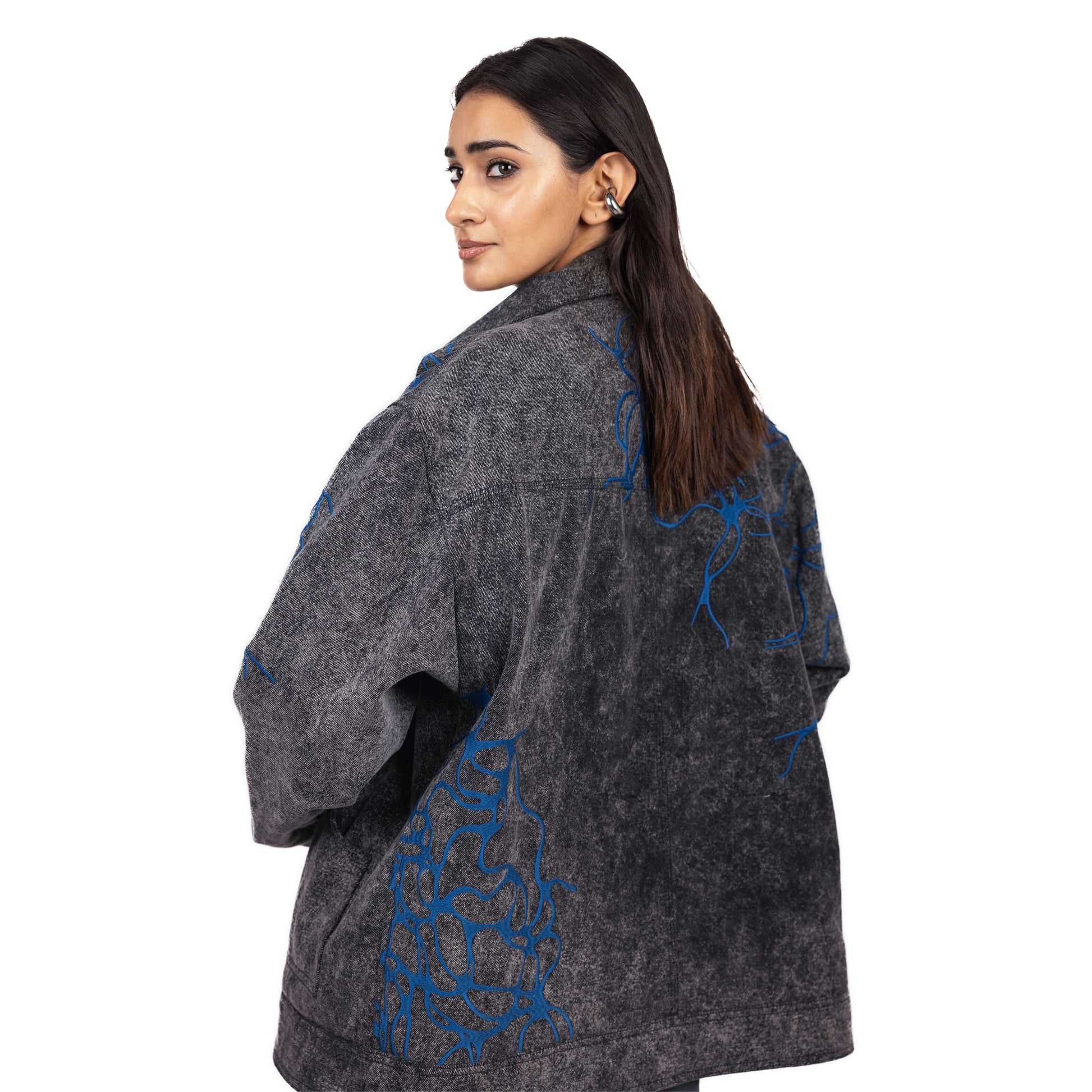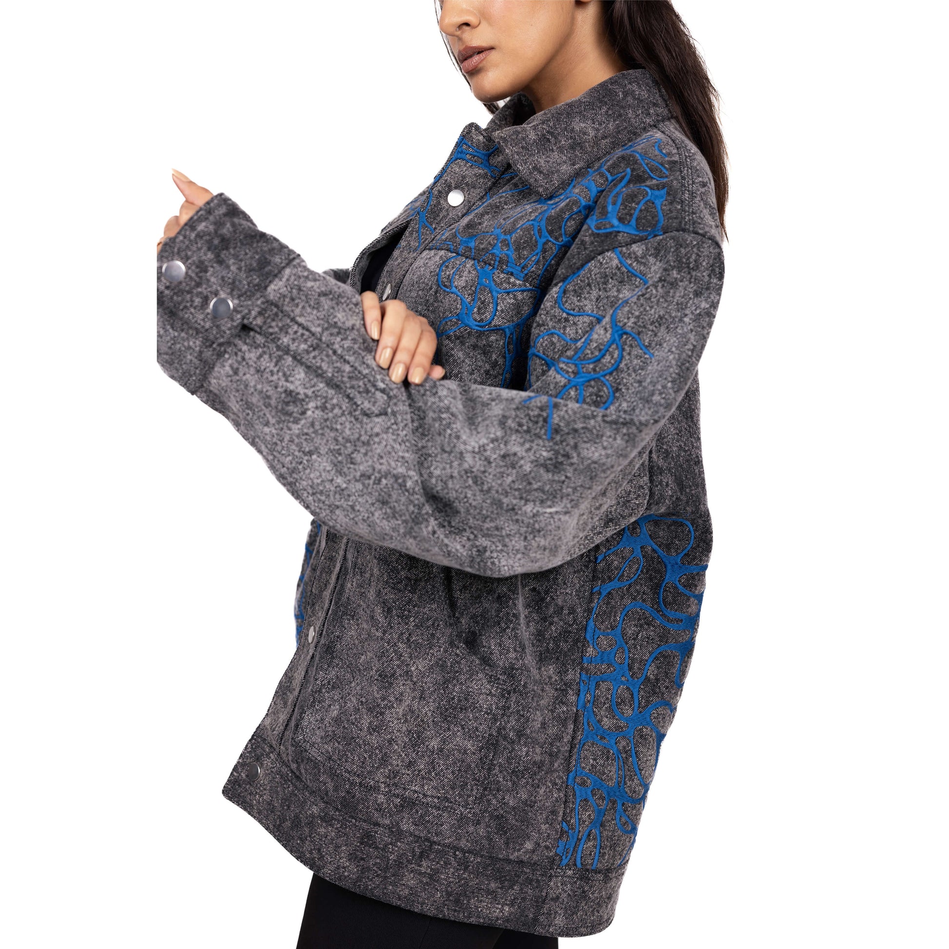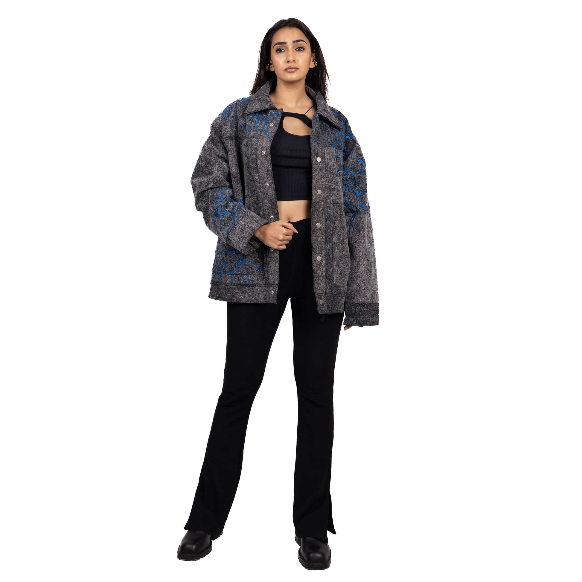 Embroidered roots surge with defiant energy across the black, washed denim. The relaxed fit and metal snap closures on the front and cuffs offer comfort and style. Patch pocket detailing adds a touch of functionality, while the all-over contrast embroidery makes a bold statement.