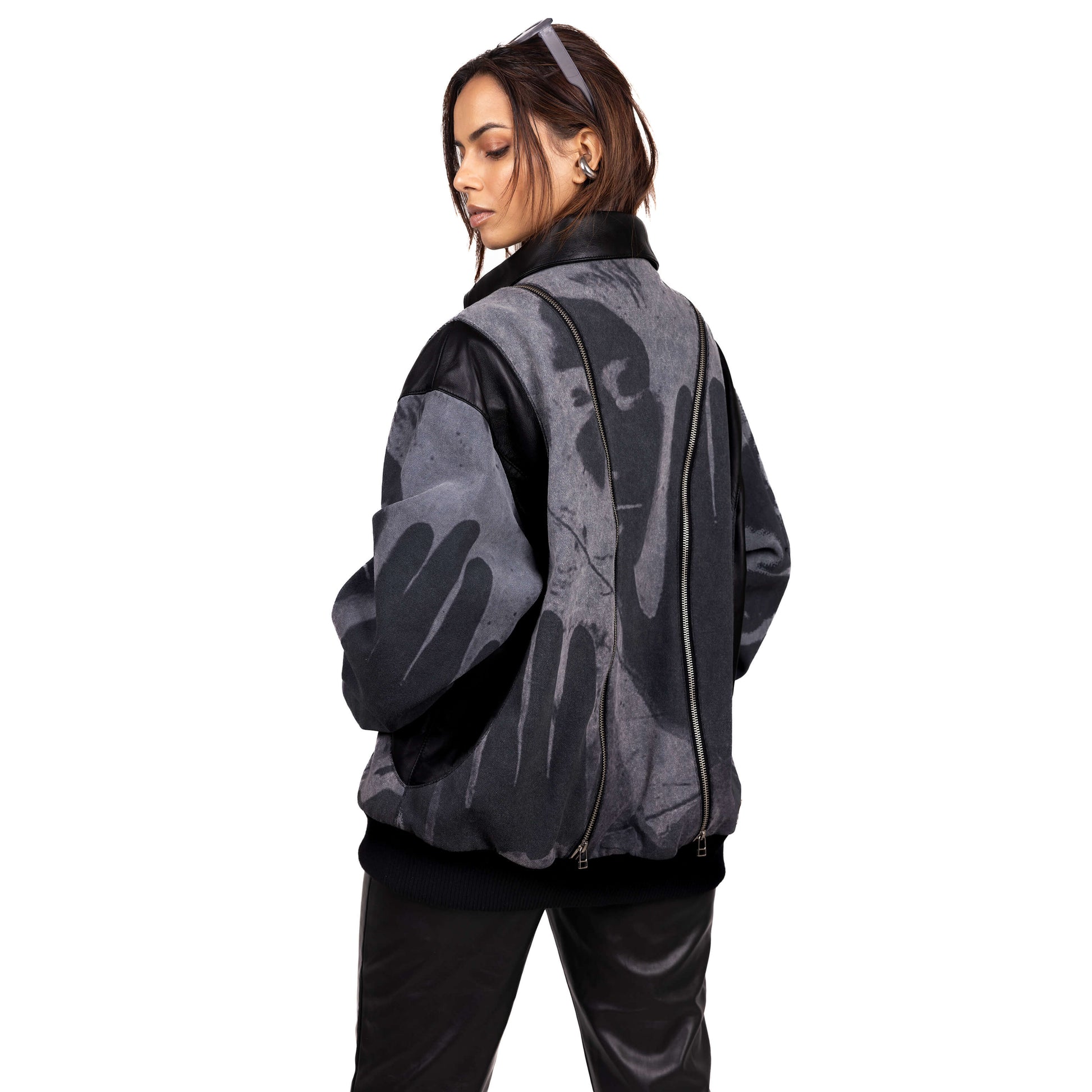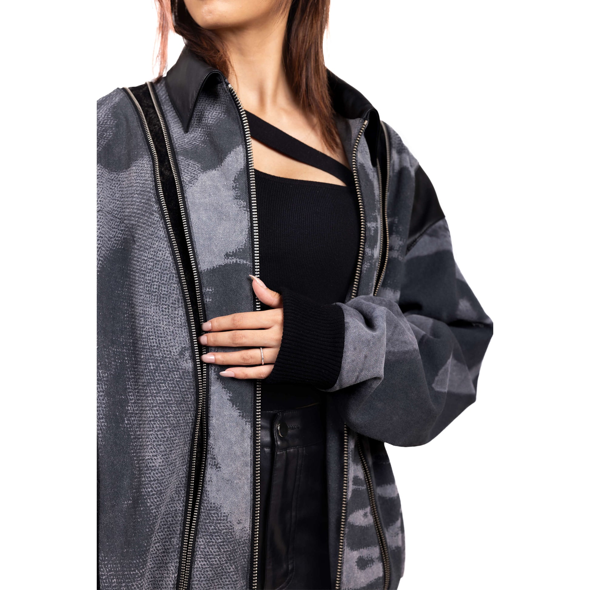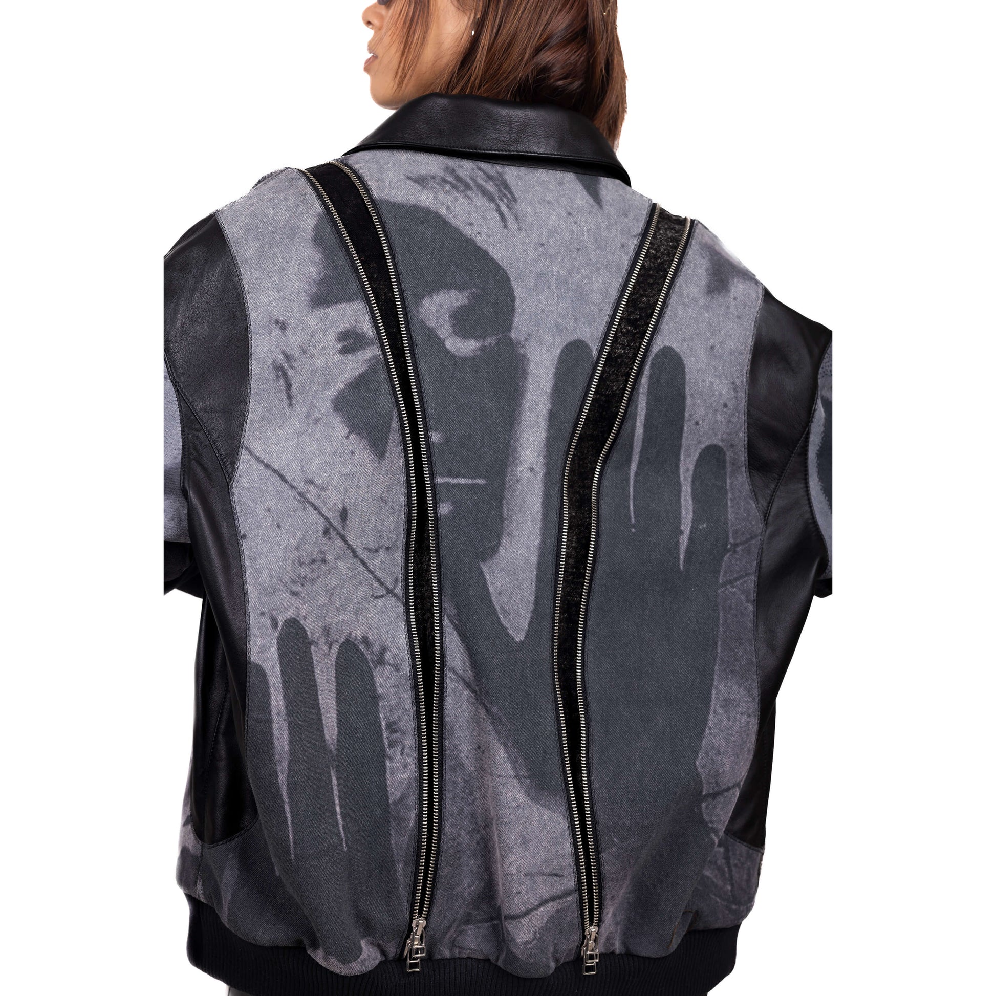 A veil of laser-printed imagery on black denim creates a captivating scene. A two-way zipper closure, convertible collar, rib detailing at the hem and cuffs, and a central metal zipper complete the look. This statement piece embodies the power of breaking free from societal constraints.