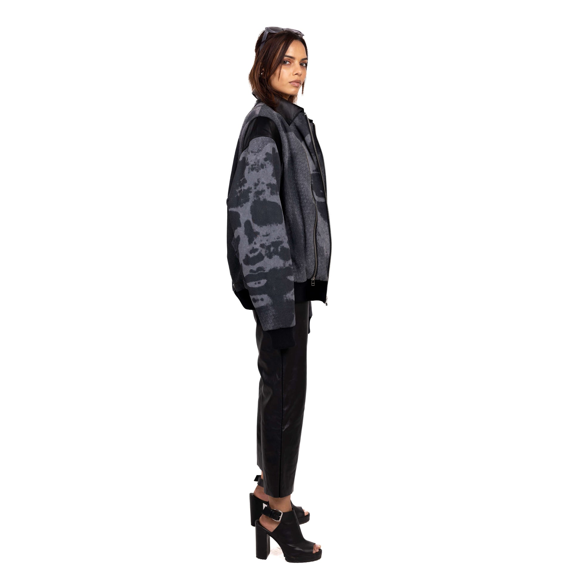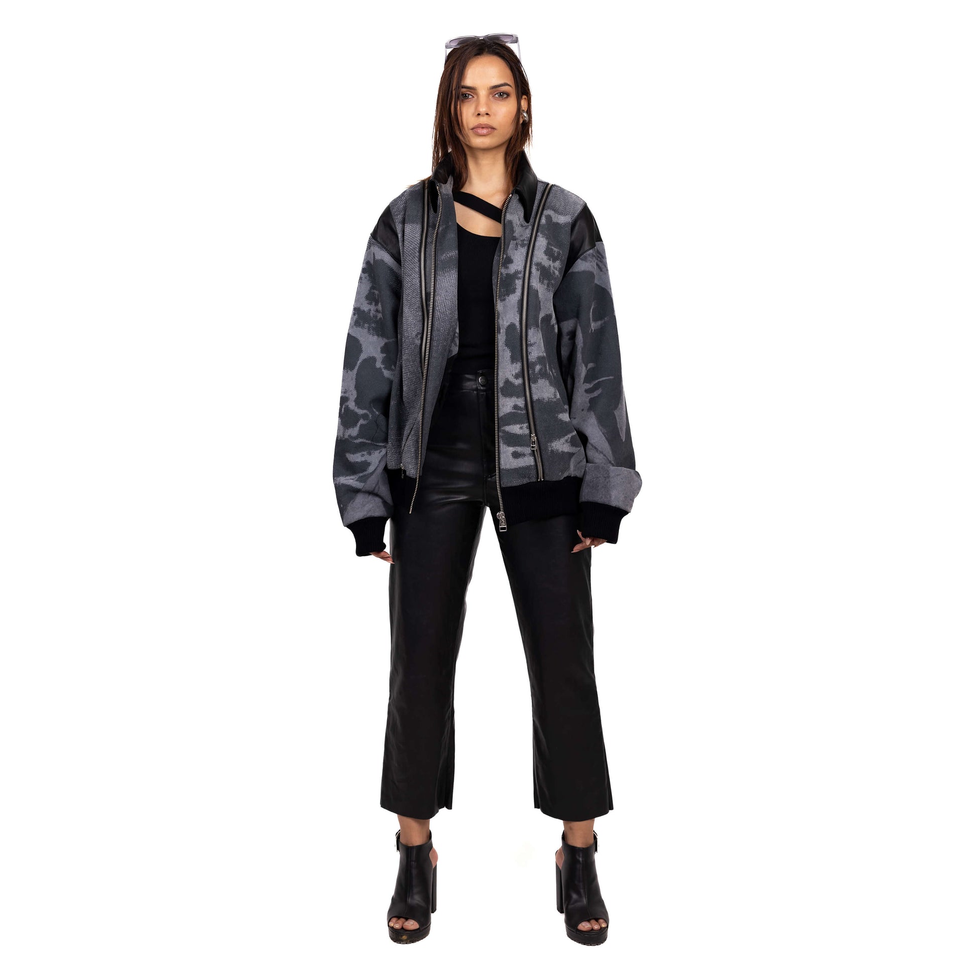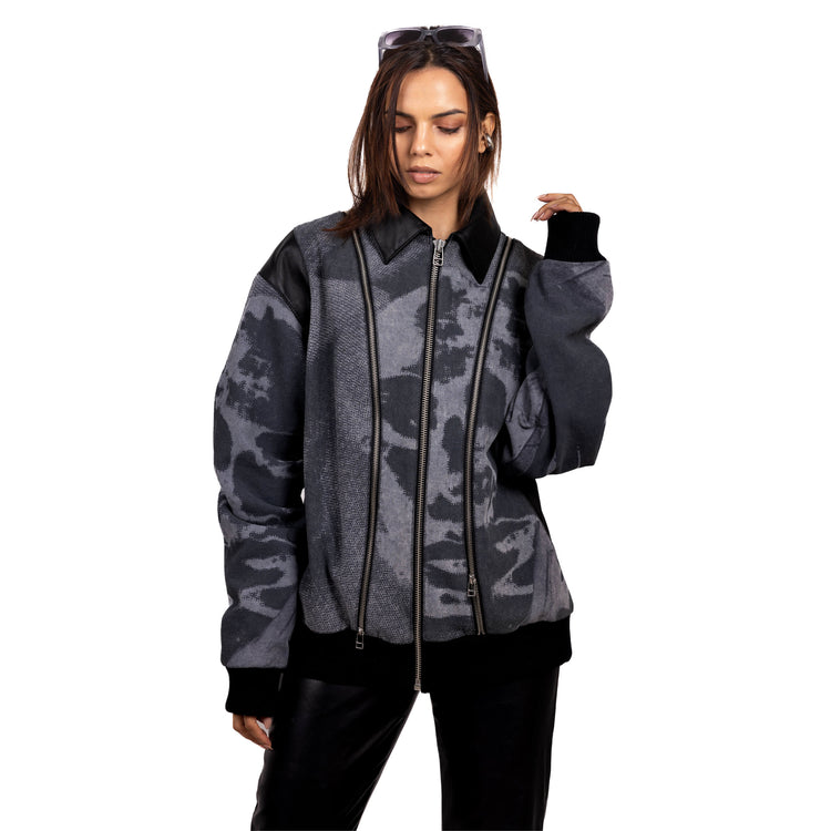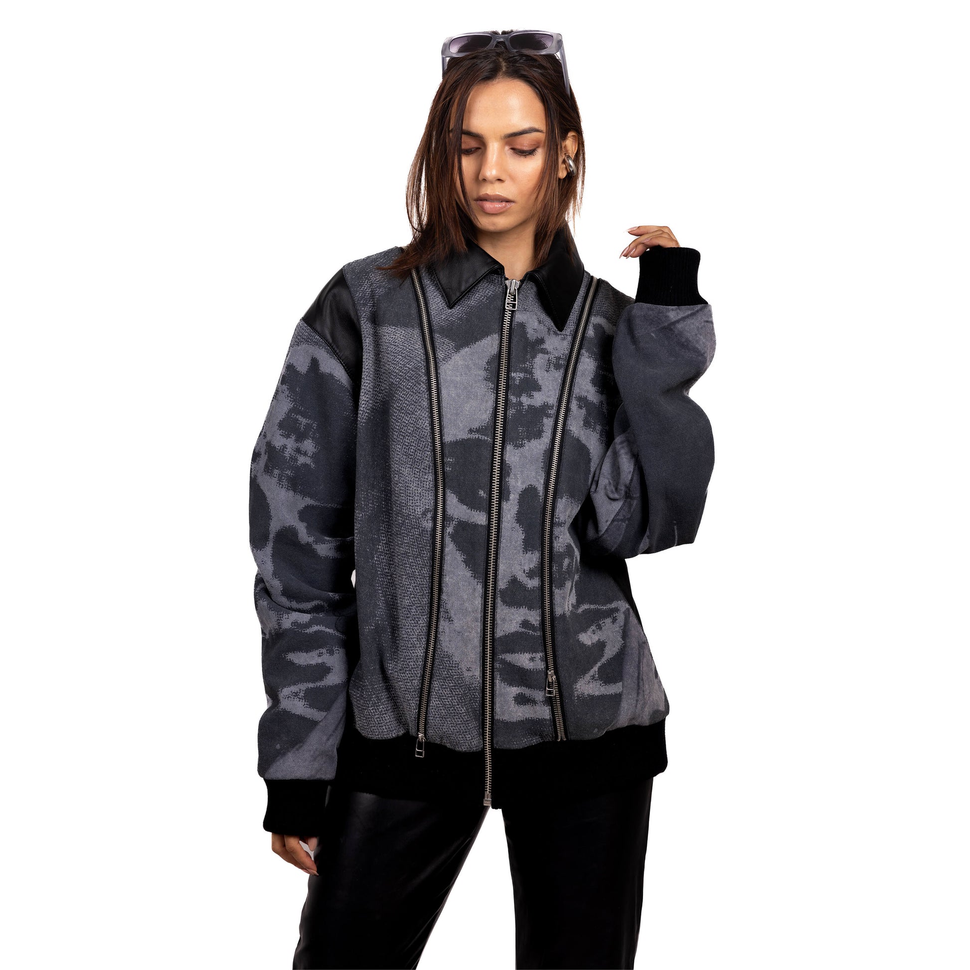 A veil of laser-printed imagery on black denim creates a captivating scene. A two-way zipper closure, convertible collar, rib detailing at the hem and cuffs, and a central metal zipper complete the look. This statement piece embodies the power of breaking free from societal constraints.