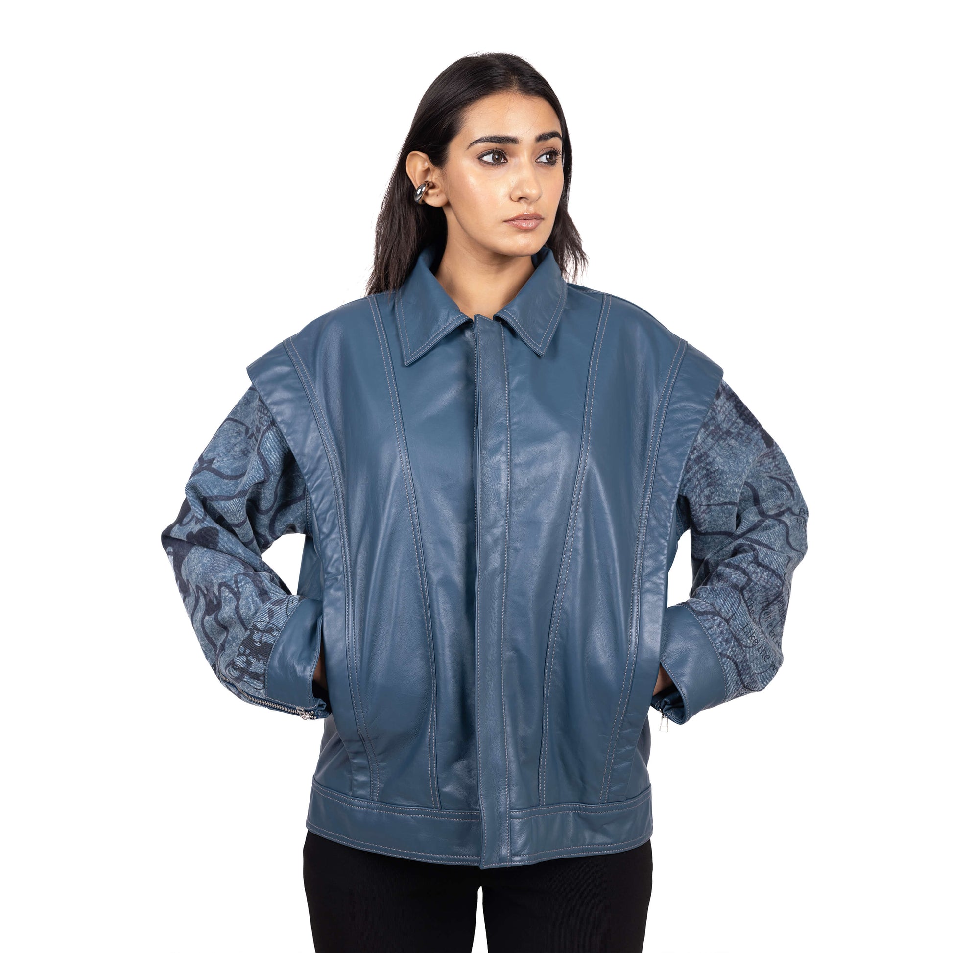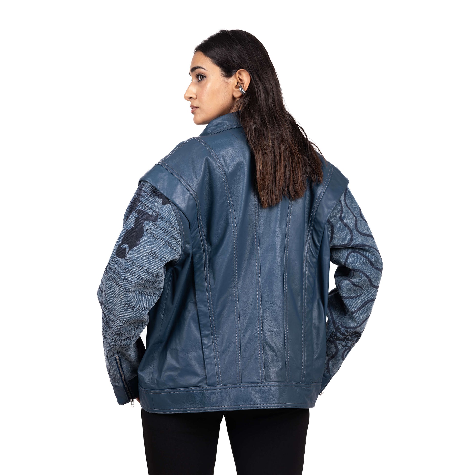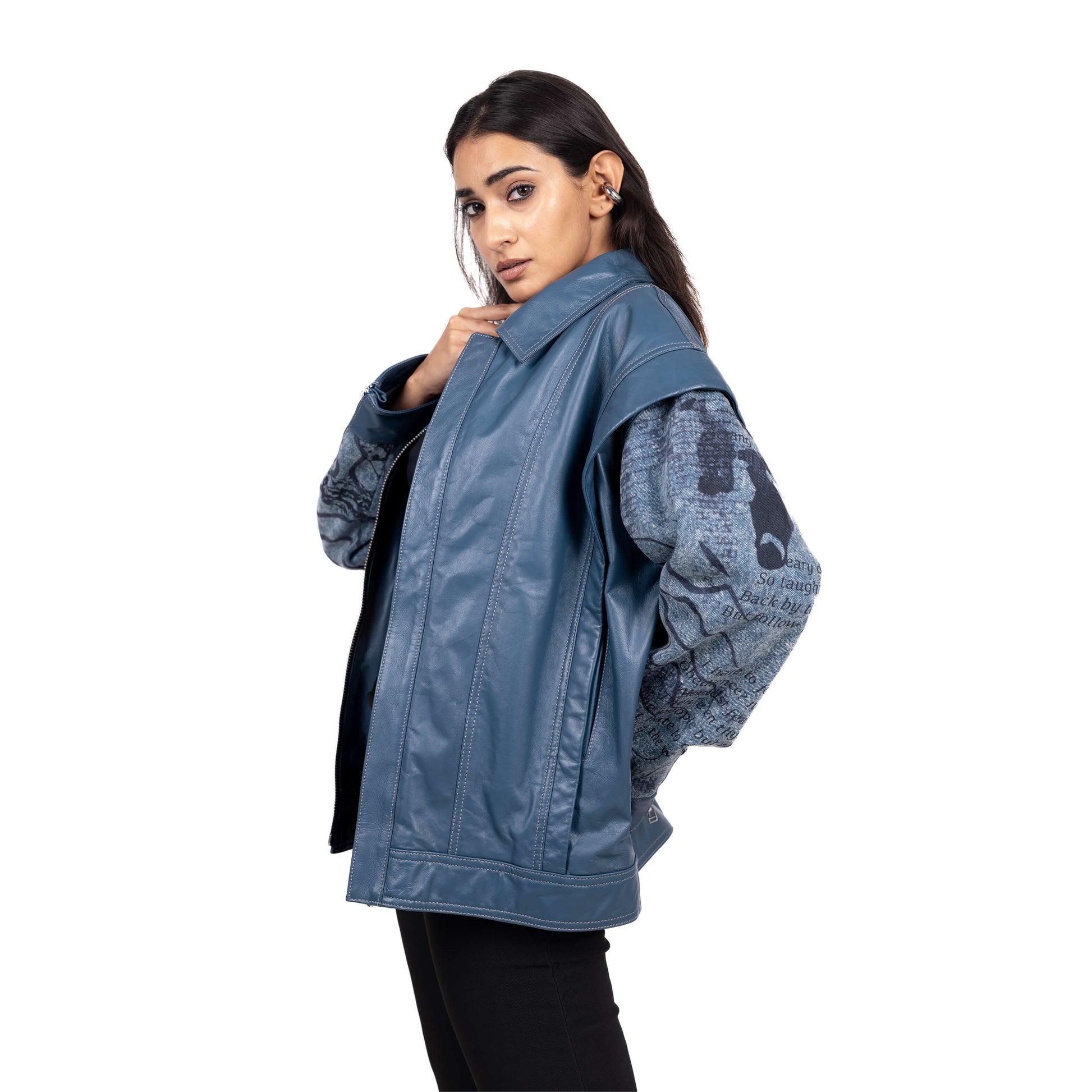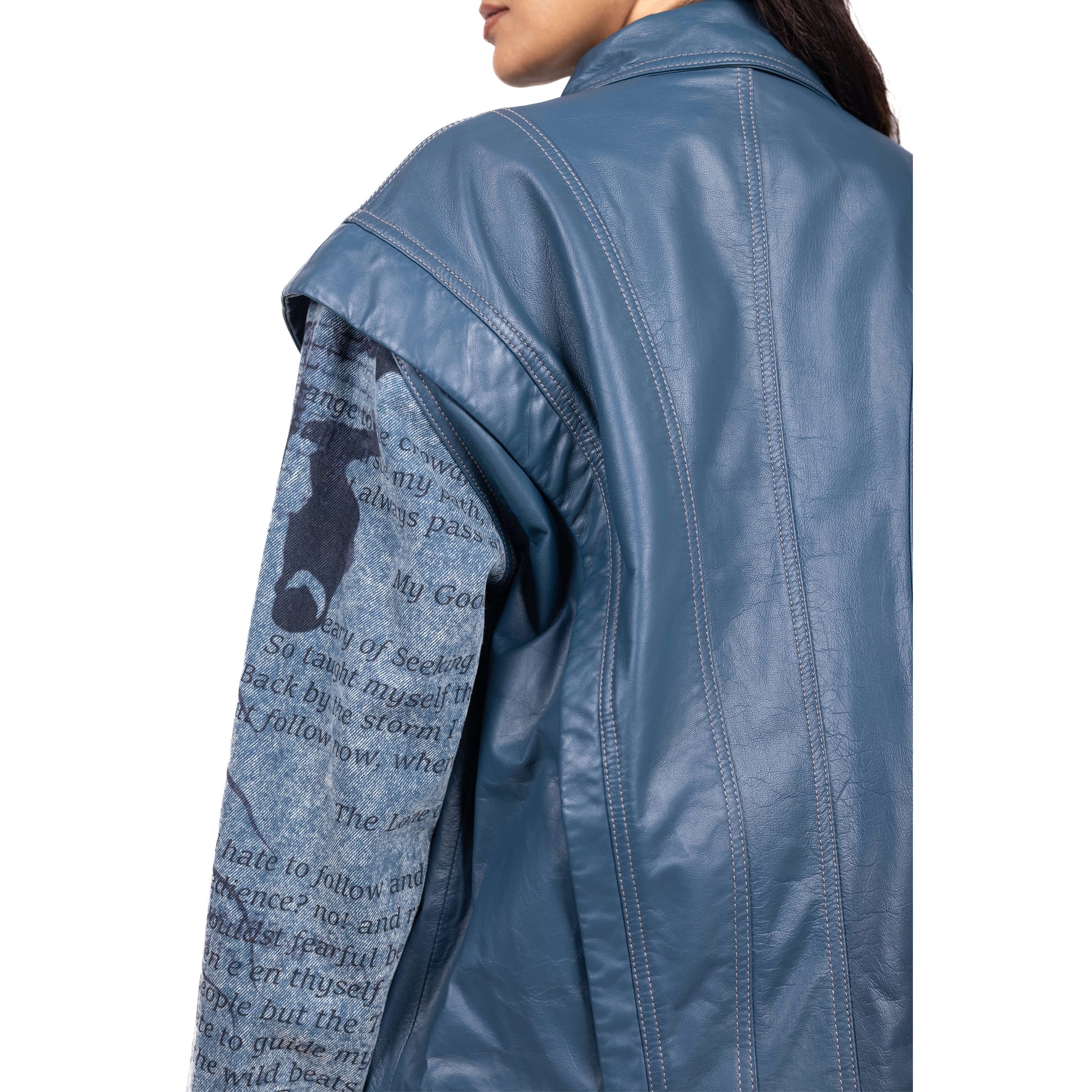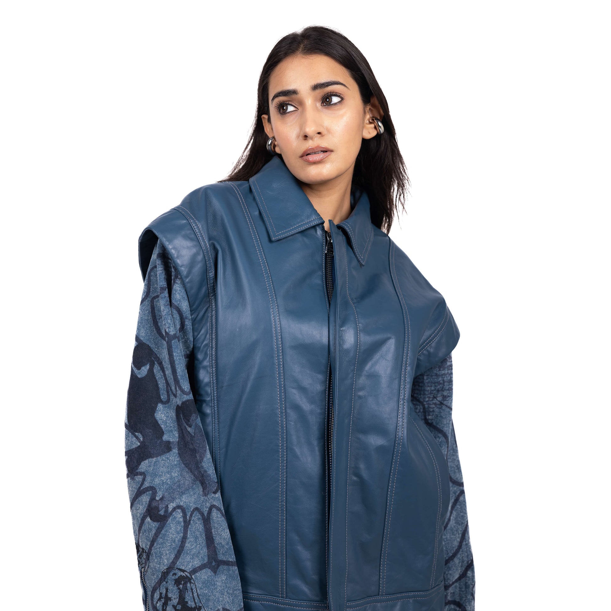 The ovoid multi-paneled leather and denim jacket represents the complexities of identity. Distorted figures with digitally printed sleeves, symbolize the fragmented search for meaning. Welt pockets on the side and voluminous sleeves with metal snap closures at the cuff offer a unique silhouette. A concealed front zipper and convertible collar add versatility.