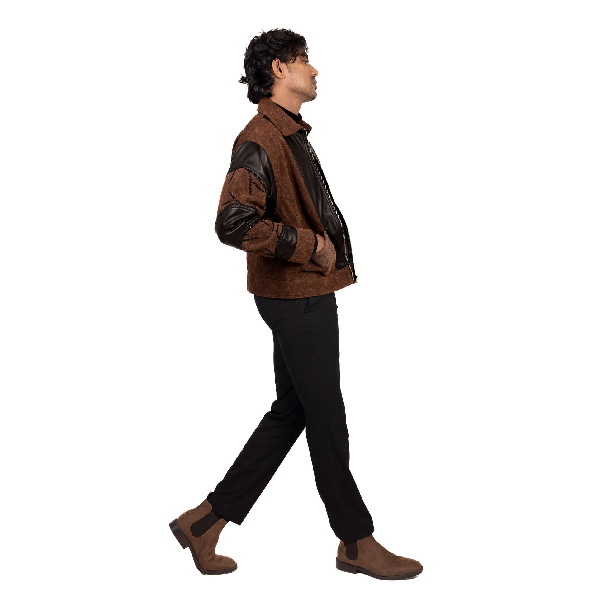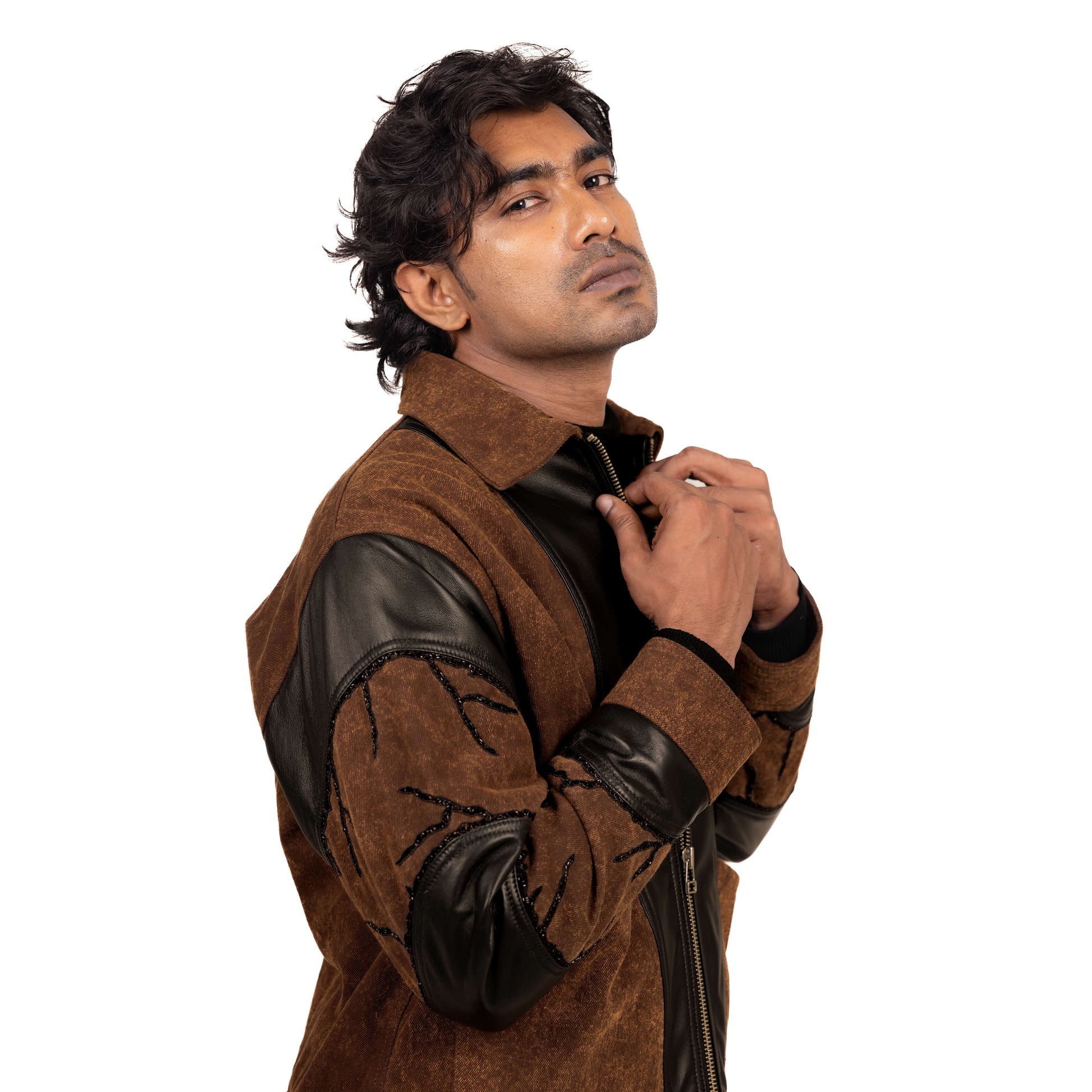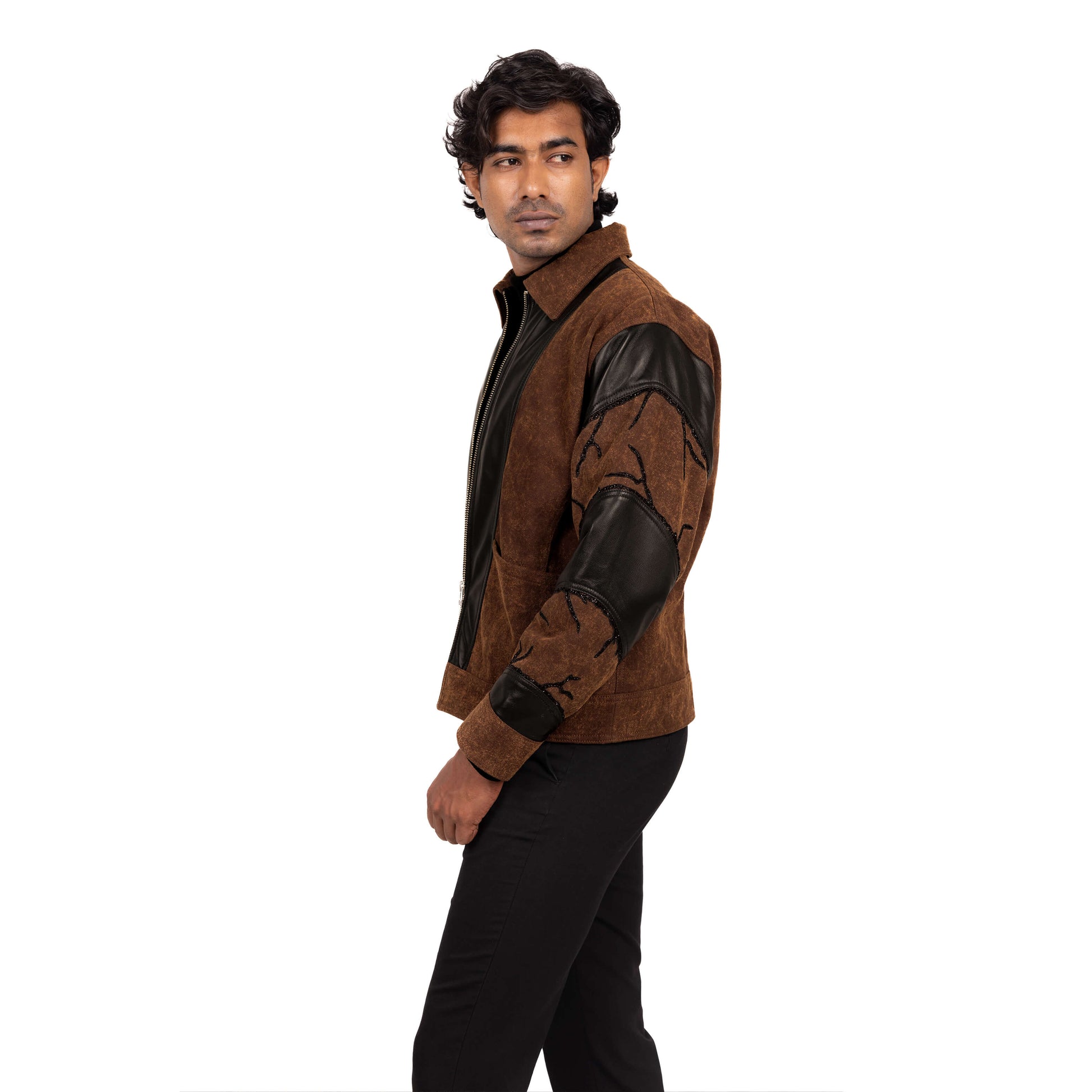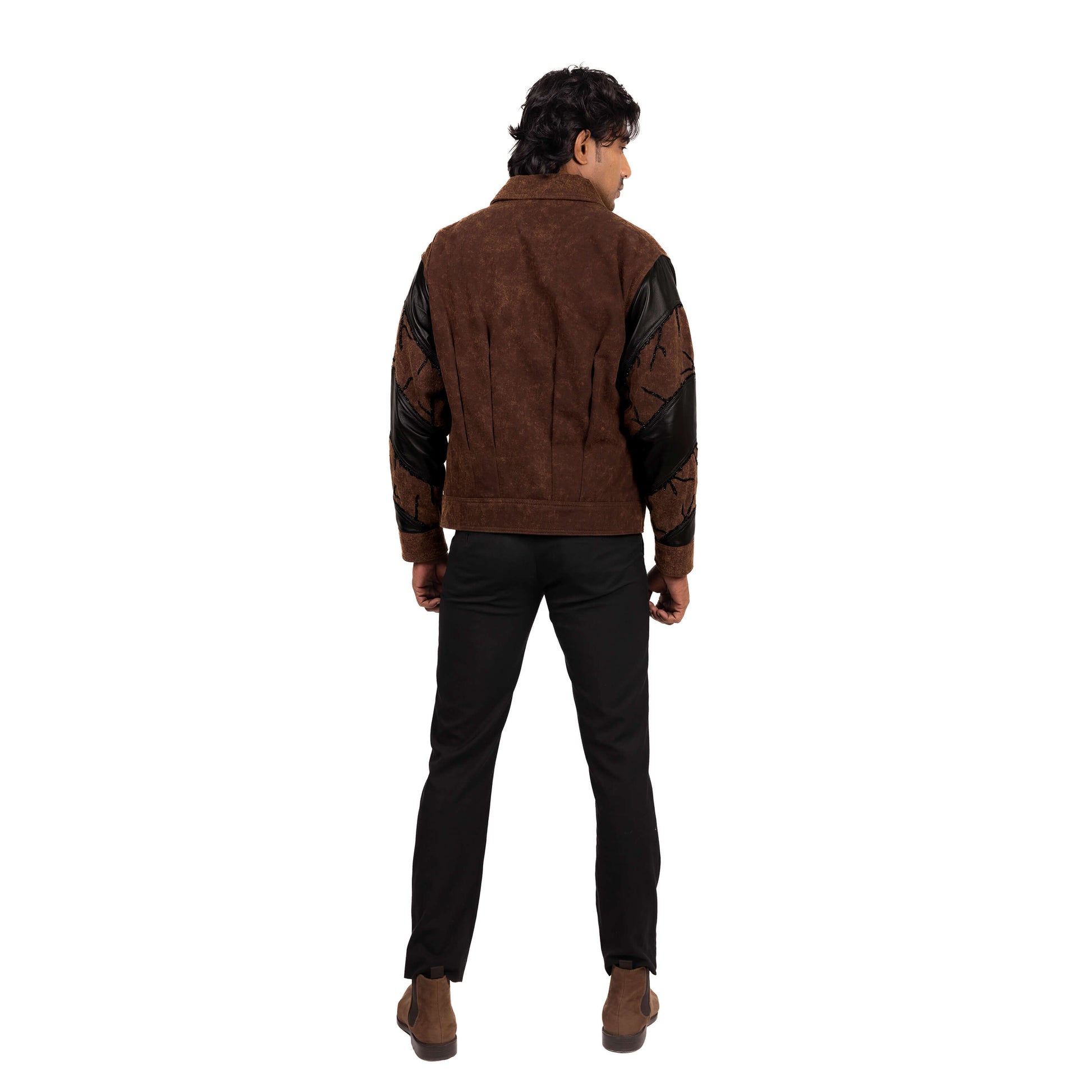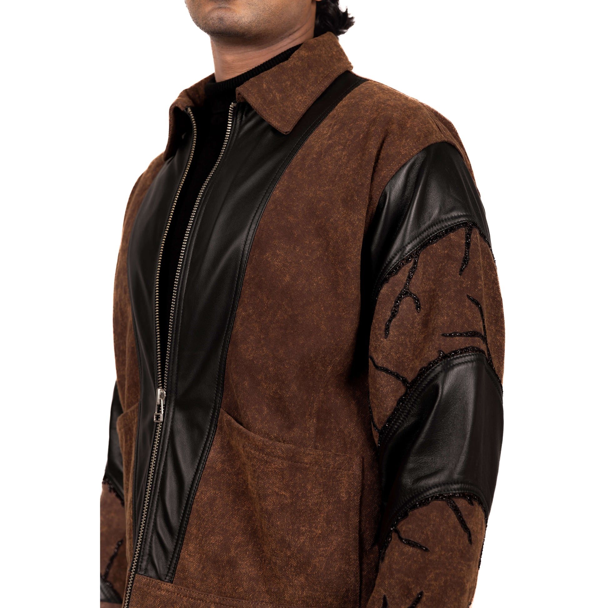 The multi-paneled leather and denim jacket celebrates impermanence with the phrase "Cracks formed over time", meticulously embroidered. Pleated back details and patch pockets add a touch of visual interest, while a metal zip front closure and convertible collar offer versatility. Washed denim and genuine sheep napa leather create a rich textural contrast.